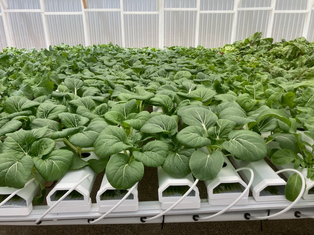 Hydroponics is a method of growing plants using mineral nutrient solutions, in water, without soil. Sweet Roots uses an NFT (Nutrient Film Technique) hydroponic system. The NFT system utilizes a thin stream of nutrient rich water combined with a climate controlled greenhouse to produce greens all year long.